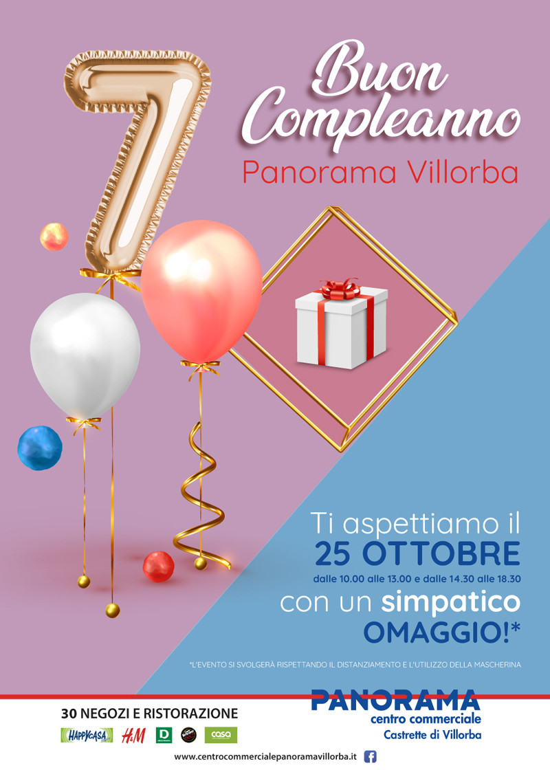 Buon Compleanno Panorama Villorba In questo anno particolare, per il 7° anniversario del Centro, regaleremo un simpatico omaggio per i clienti in galleria nel rispetto delle necessarie misure di sicurezza. Domenica 25 Ottobre presso il Centro Commerciale Panorama Villorba